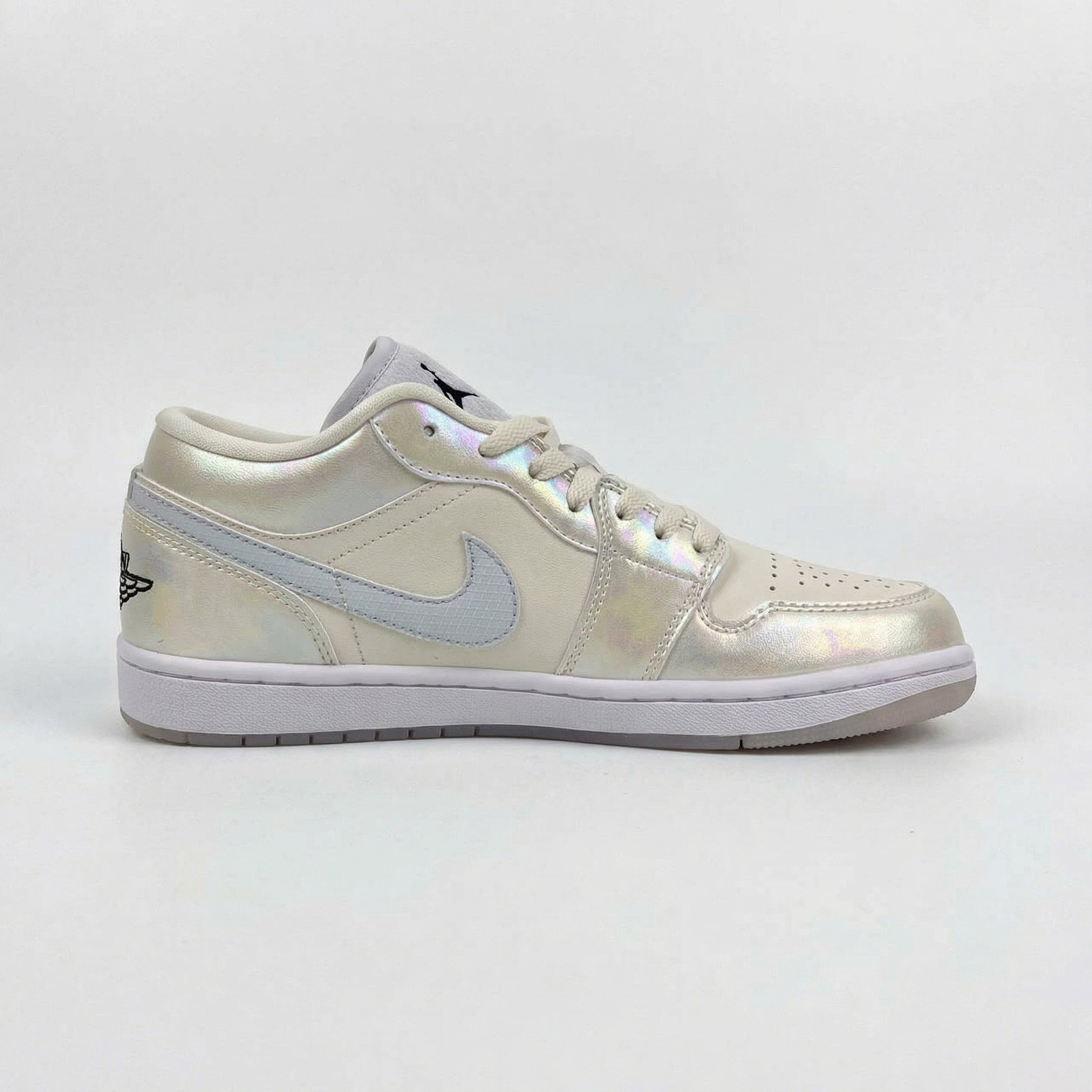 Step into the spotlight with this eye-catching iteration of the Air Jordan 1 Low, a silhouette that takes the classic court design and elevates it with a futuristic, luminous finish. This pair perfectly balances a clean, neutral foundation with bold, light-catching details.