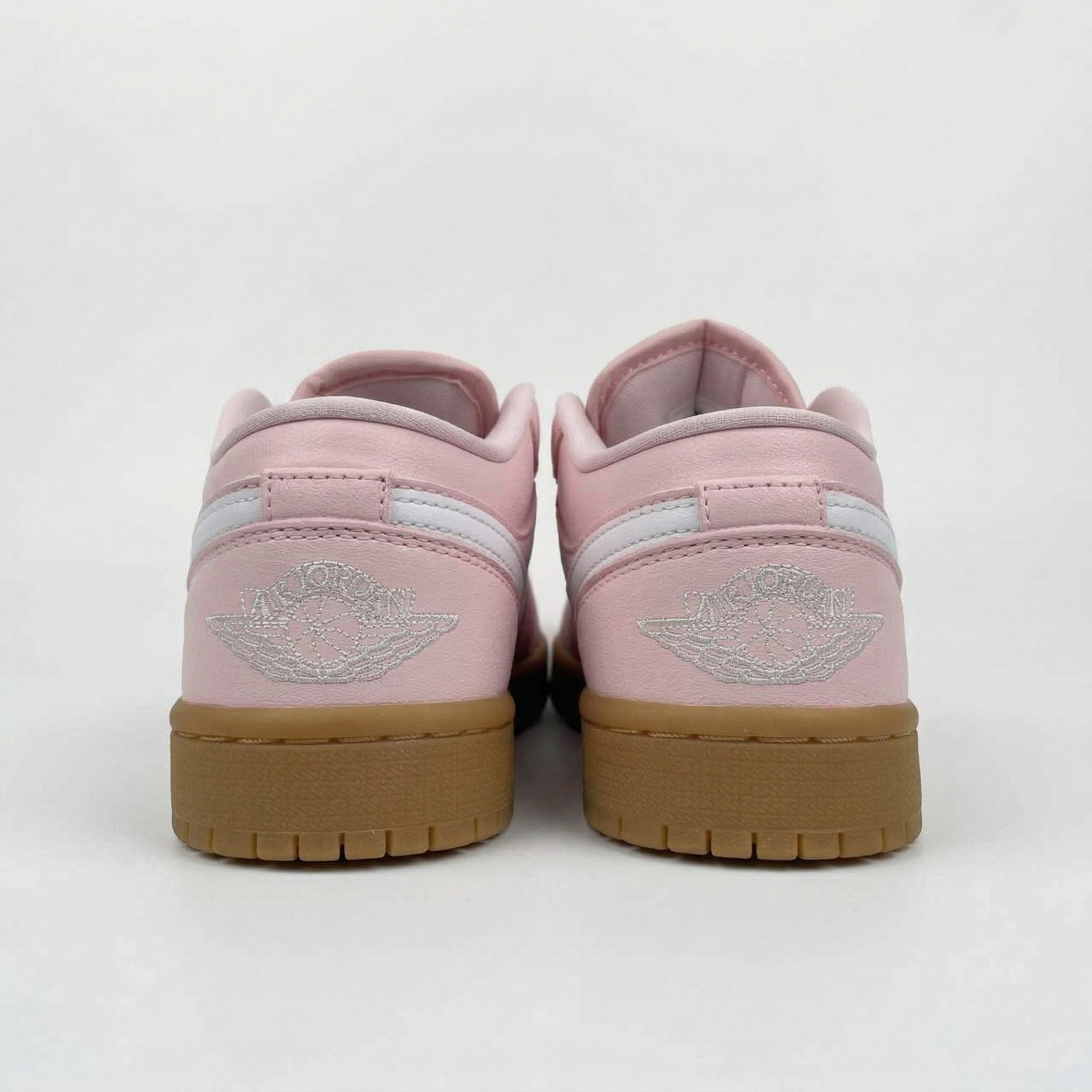 Heritage branding ties the upper together, featuring a contrasting white Jumpman logo on the tongue and a classic Air Jordan Wings logo intricately embroidered in white thread on the heel counter. The absolute standout feature of this pair is the sole unit: instead of the traditional white midsole, this shoe utilizes a full gum brown rubber midsole and outsole setup, giving the sweet pastel upper a grounded, retro-lifestyle finish.