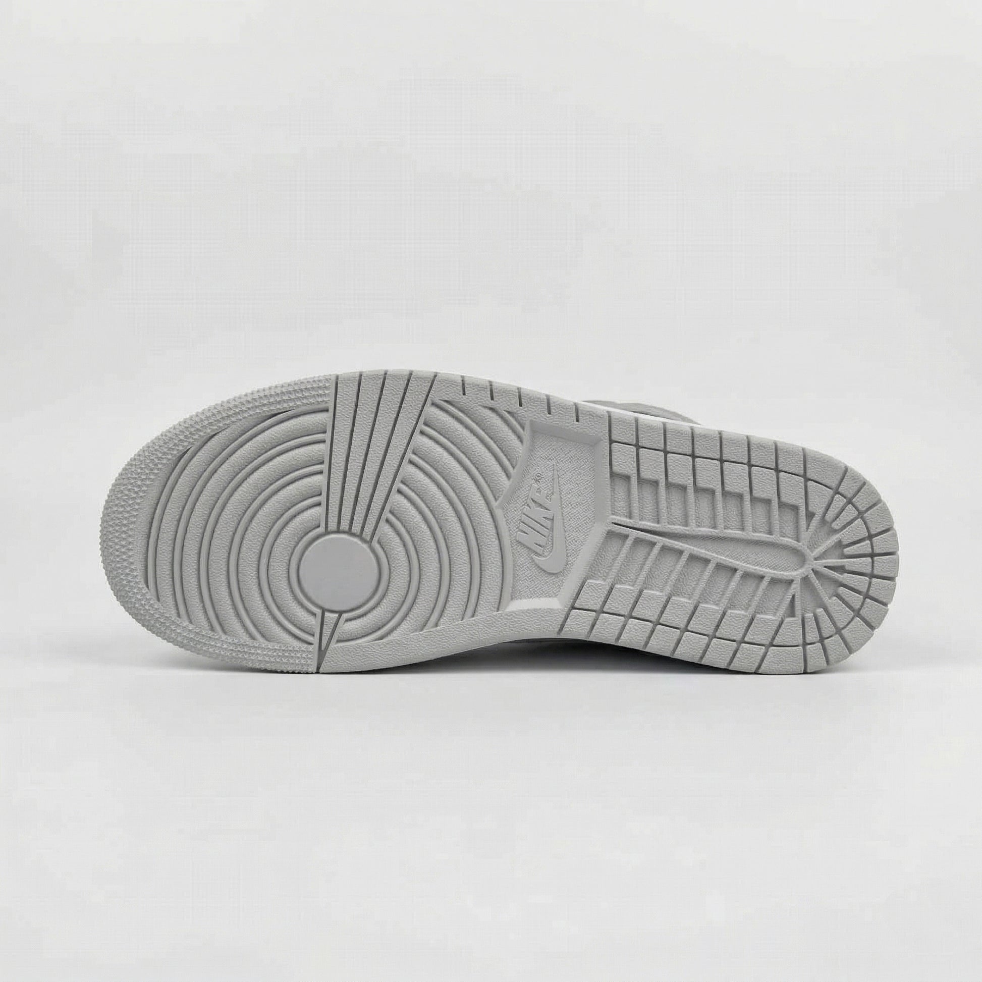 Sole: Tan/Sand colored midsole paired with a Light Grey rubber outsole featuring the AJ1 pivot-circle tread